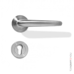 Drückergarnitur in matt gebürstetem Edelstahl mit robuster Metall-Unterkonstruktion. Die Edelstahl-Rosetten verleihen jeder Zimmertür ein elegantes und zeitloses Erscheinungsbild. Ideal geeignet für Innen- und Wohnungseingangstüren. Das perfekte Accessoire für Deine Innentür.